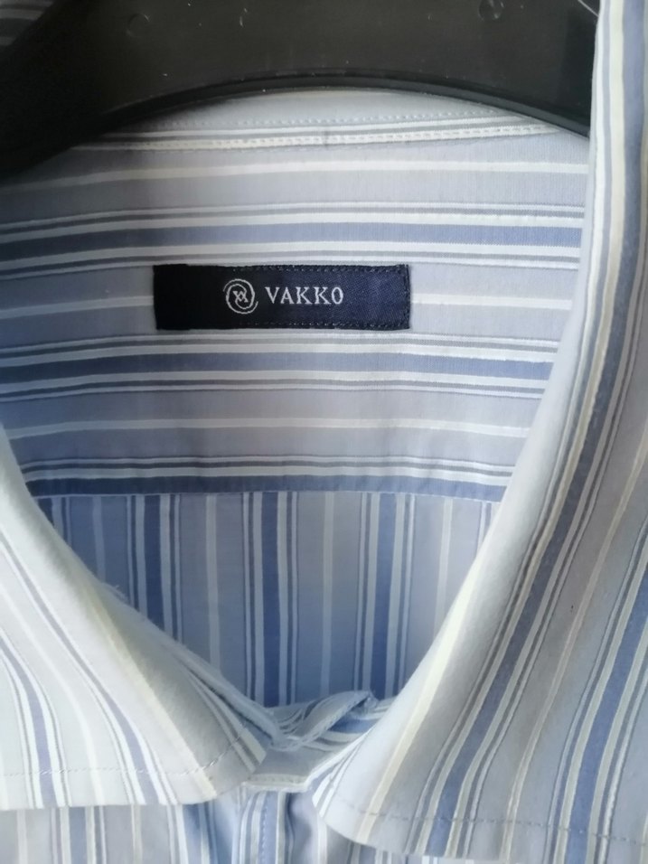 Vakko markalı mavi erkek gömlek, V yaka, düğmeli ve uzun kolludur. Çizgili desenli, regular fit ve sentetik kumaştandır. Ofis ve sokak stiline uygundur.