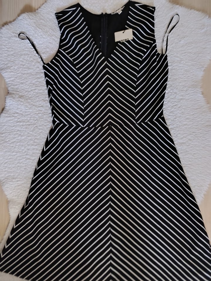 V yaka ve kolsuz tasarıma sahip, siyah-beyaz çizgili pilili, dar kesim midi elbise.