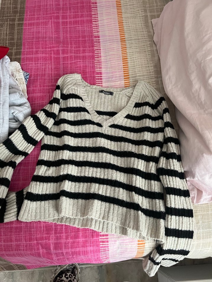 V yaka ve uzun kollu, yumuşak örgüden yapılmış, bol kesim kadın kazak. Gri ve beyaz çizgili desene sahip, rahat sokak stiline uygun.