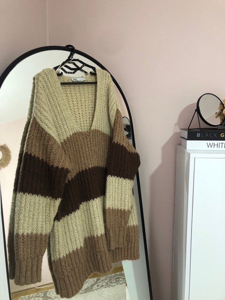 V yakalı, çizgili ve örgü detaylı, kahverengi ve gri tonlarda bol kesim kadın kazak. Yumuşak örgü kumaştan, rahat sokak stili için uygundur.
