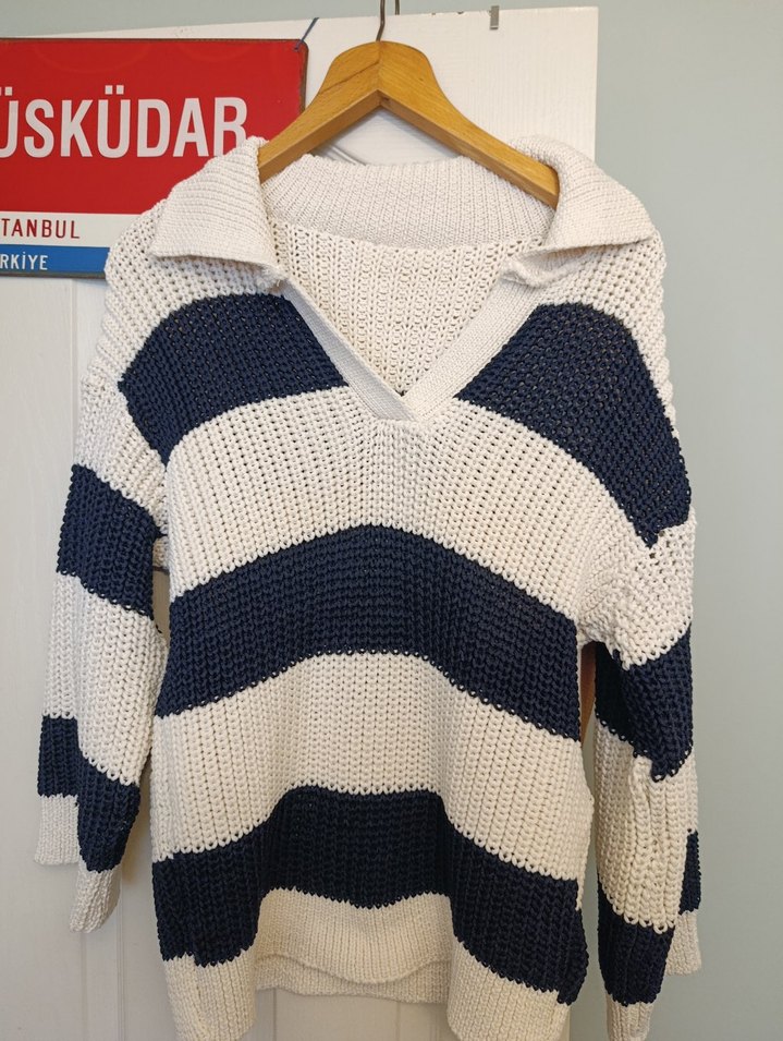 V yaka çizgi örgü kadın kazak. m-l bedene uygundur. Xl de olur. örgü ama çok esnektir.