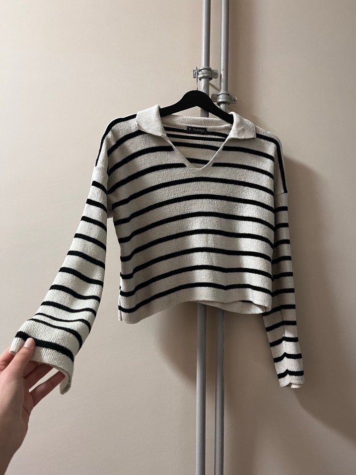 V Yaka Çizgili Örgü siyah-Beyaz Kadın Kazak