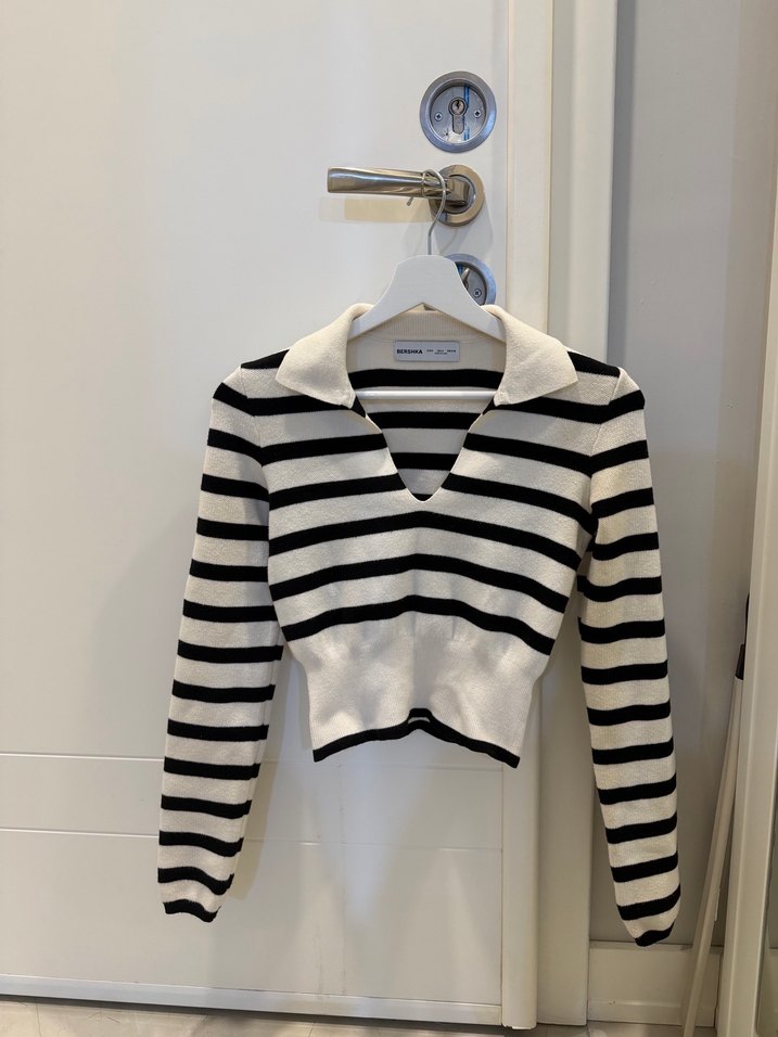 Uzun kollu, V yakalı ve ince kesim olan bu triko kazak, beyaz zemin üzerine koyu çizgilerle örülmüş pamuklu kumaştandır. Paris esintili sokak tarzı sunar.