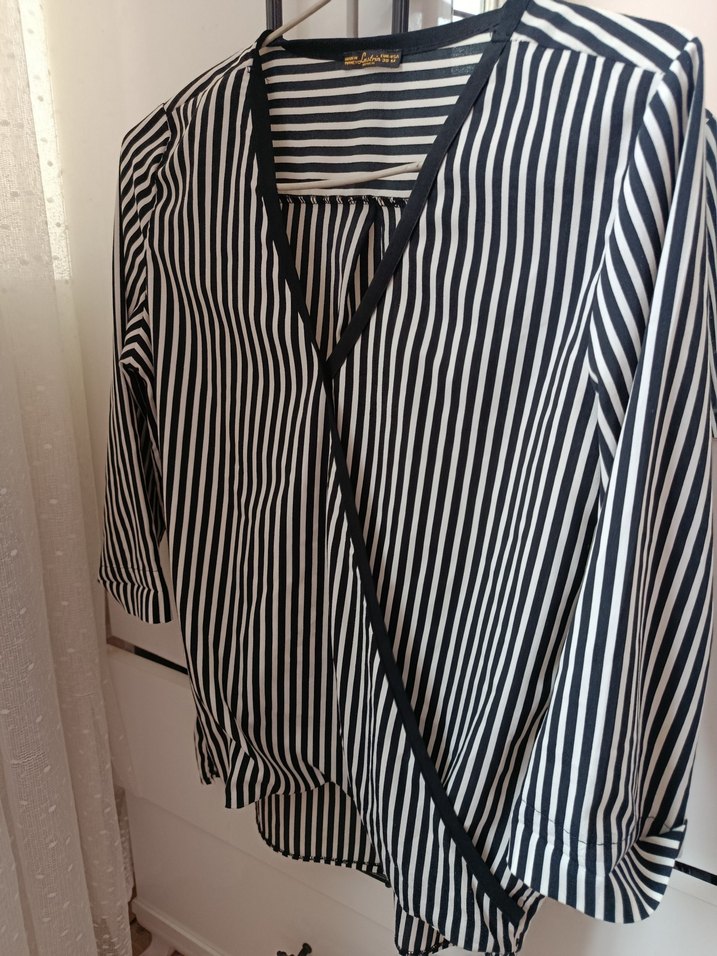 V yakalı, pilili ve askılı kollu, rahat kesim kadın gömleği. Sentetik kumaştan, koyu çizgili desende, ofis ve sokak stiline uygun.