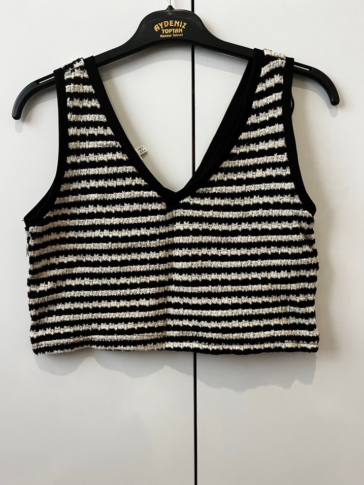 V yaka, çizgili siyah ve gri renklerde, örgü kumaştan yapılmış kısa kollu, dar kesim crop top.