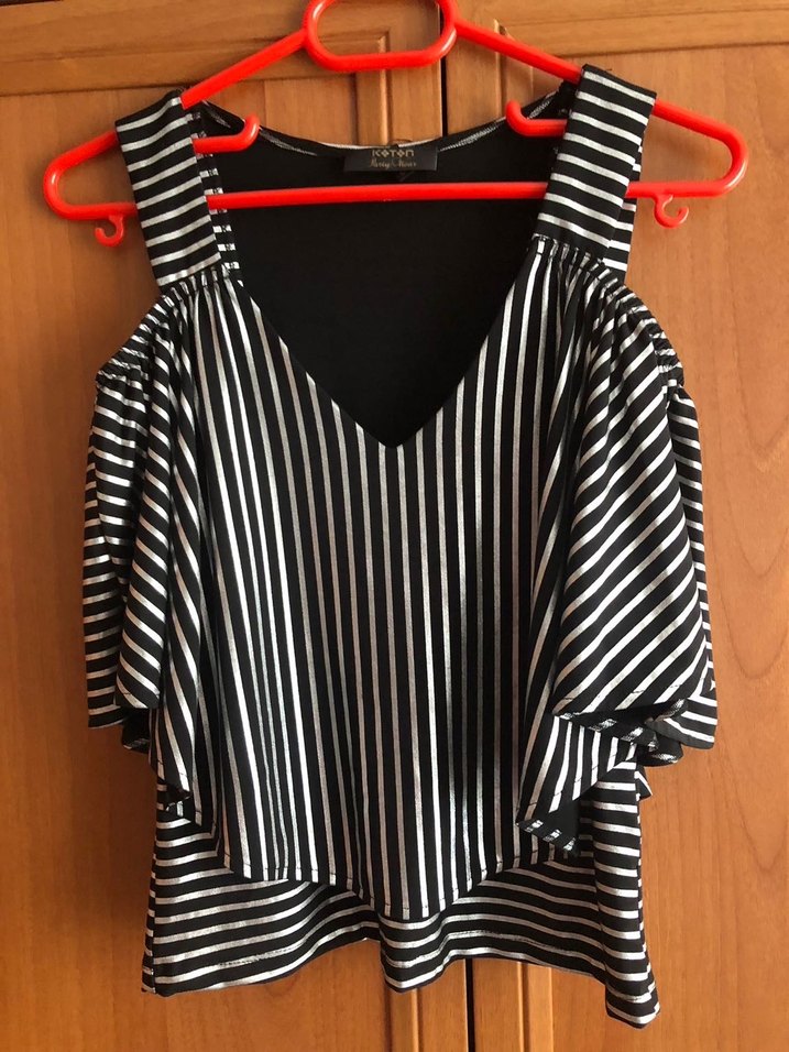 Siyah çizgili kadın bluz, V yaka ve askılı kollara sahip