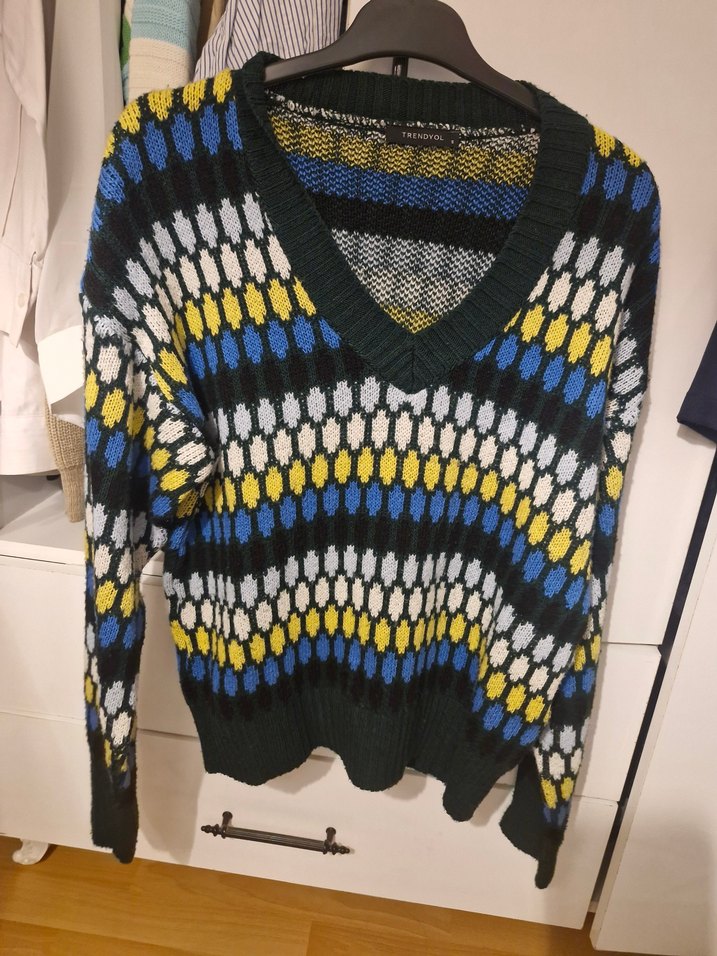 V yaka, uzun kollu, bol kesim kadın kazak. Çok renkli desenli örme kumaştan, bohem tarzına uygun rahat bir parça.