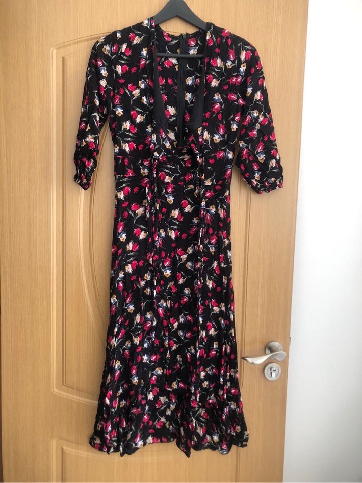 V yaka, çok renkli çiçek desenli, uzun ve bol kesim elbise. Yumuşak sentetik kumaştan, drapeli ve askılı kollu, romantik akşamlar için uygun. M/38 bedendir 1 defa giyildi