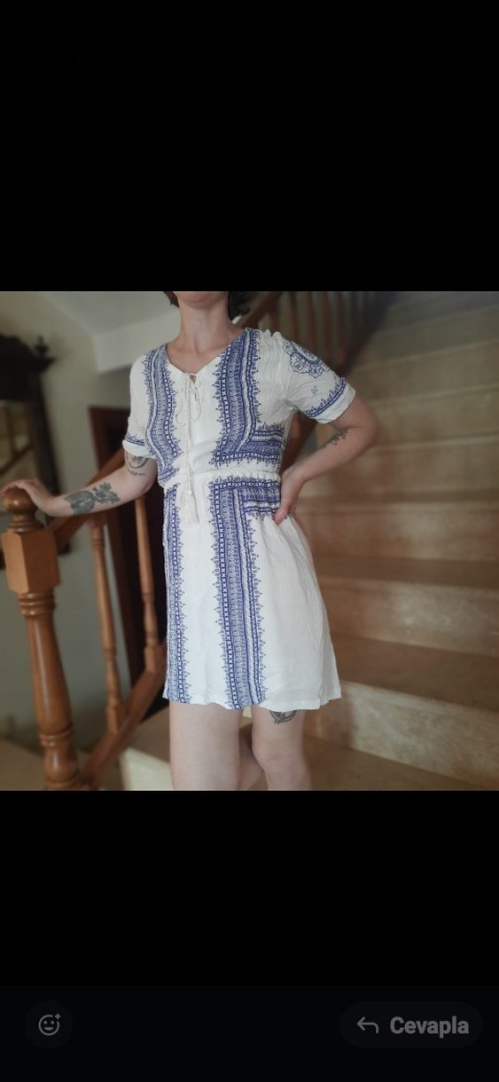 Pamuk kumaştan, kısa kollu, V yakalı ve dantel detaylı, beyaz üzerine mavi batik desenli bol kesim midi elbise. Bohem tarz için uygundur.