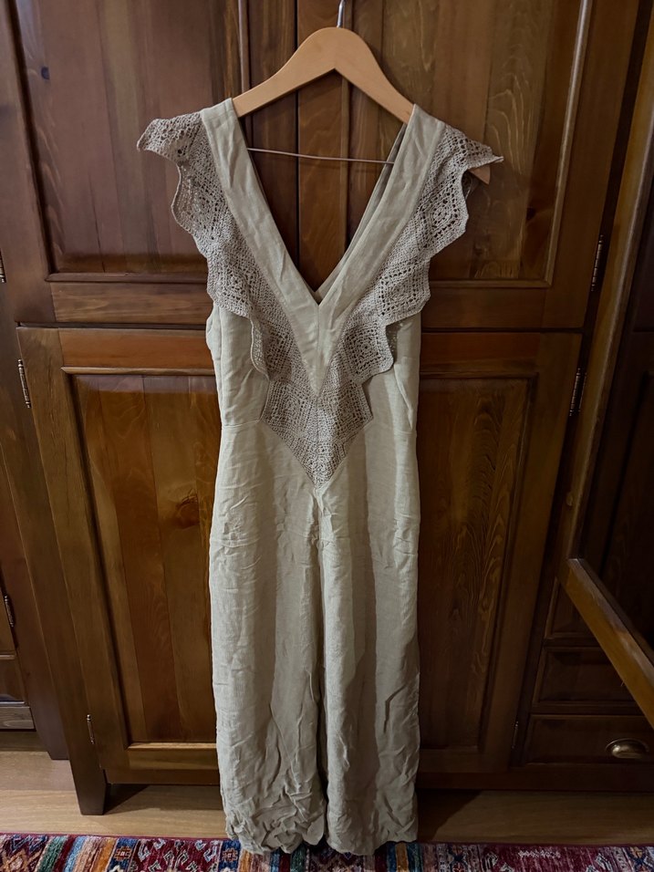 Bej keten kumaştan, V yaka ve dantel detaylı, bol kesim uzun boy elbise. Bohem tarzı ve düğün için uygun, kolsuz tasarım.