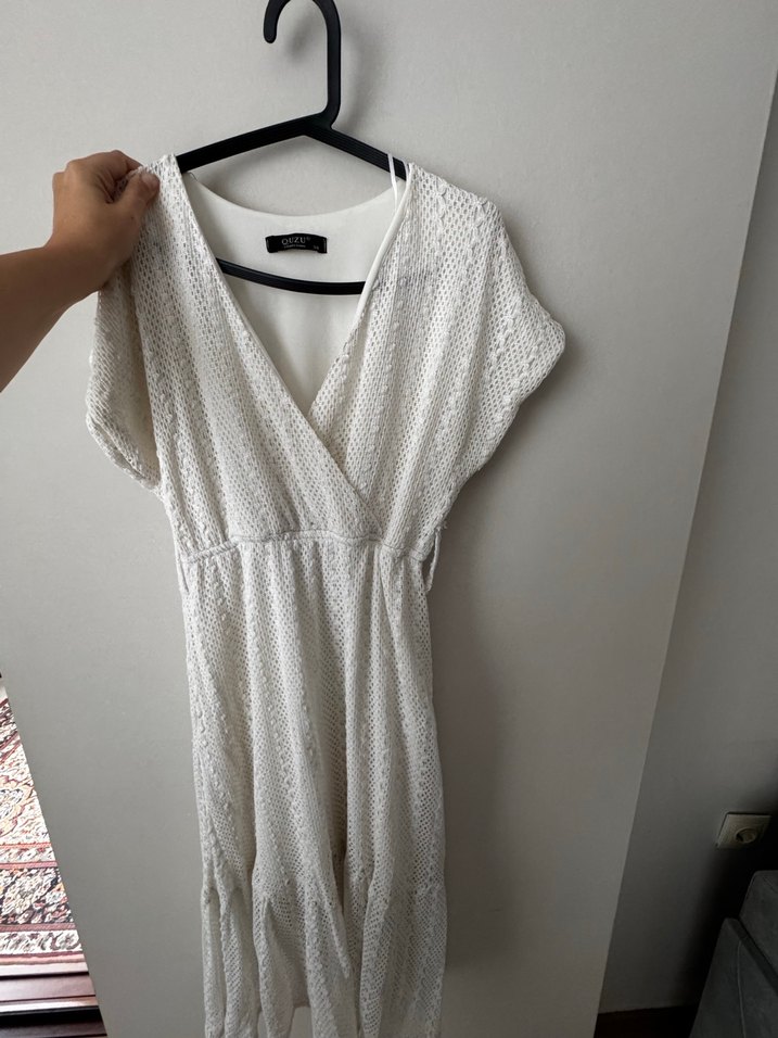 V yaka, kısa kollu midi elbise. Pamuk kumaştan, dantel detaylı ve salaş kesimli, günlük kullanım için uygun.