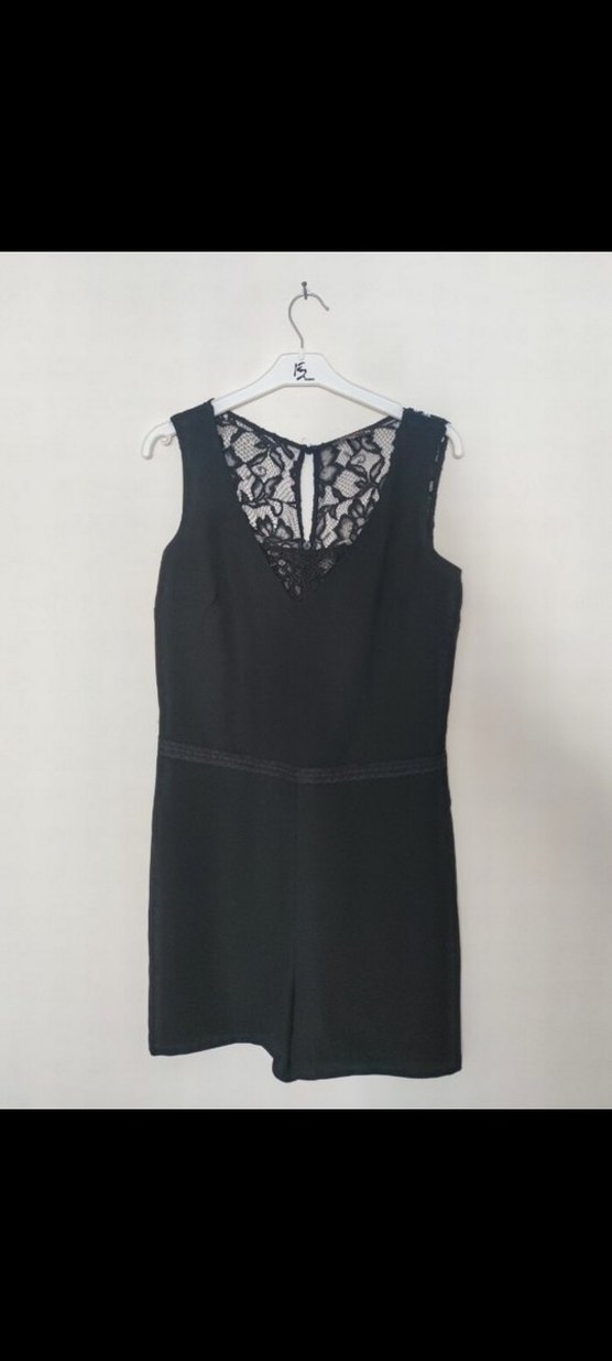 V yaka, dantel işlemeli, kolsuz ve fit kesime sahip siyah mini jumpsuit, romantik akşamlar için uygundur. ✨