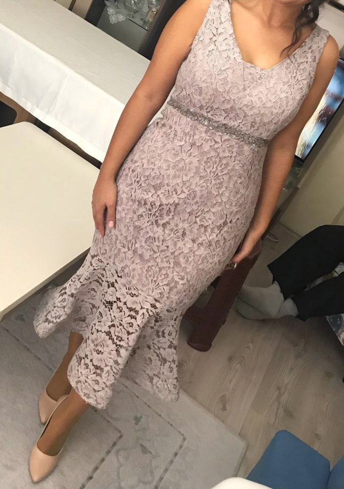 V yaka, dantelli ve kolsuz Midi abiye elbise. Bej renkte, klasik ve şık bir görünüm sunar. Romantik akşamlar için uygundur. 38-40 beden aralığındadır.
