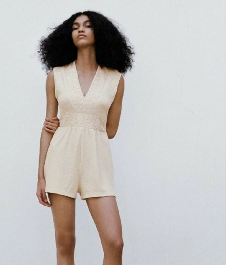 V yaka ve kolsuz tasarıma sahip, dantelli ve bej renkli kısa elbise. İpek gibi kumaştan yapılmış, minimal ve çağdaş tarzda, günlük kullanıma uygun.