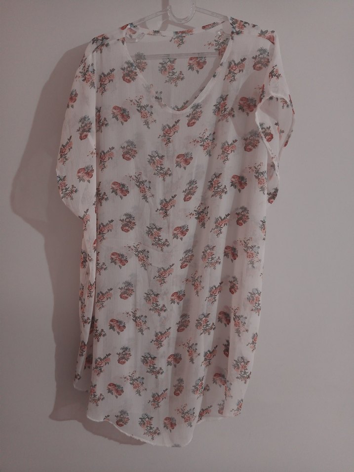 Kadın pareo, V yaka ve kısa kollu, dökümlü tül tasarımla. Sentetik kumaştan, bol kesim, gri-beyaz çiçekli desenli.