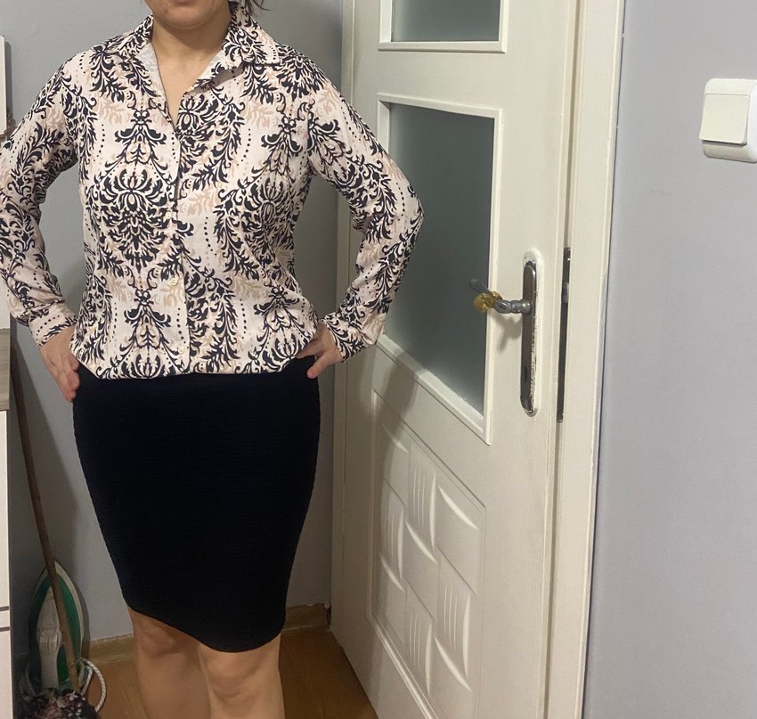 V yaka, uzun kollu, düğmeli ve baskılı kadın ofis gömleği. Krem ve gri tonlarda, sentetik kumaştan, şık ve modern kesim.