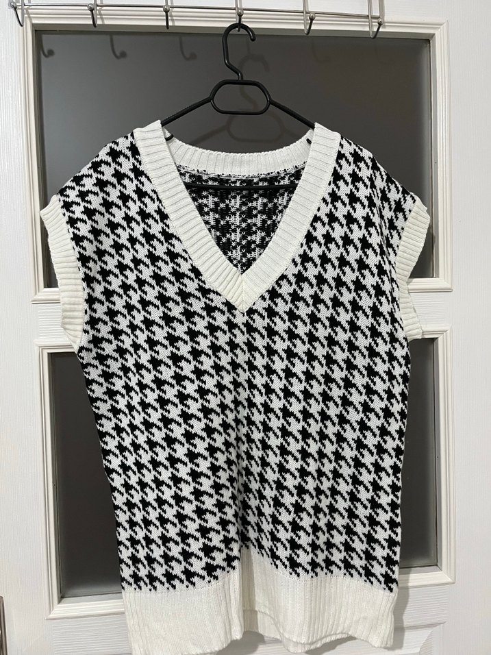 V yakalı, örme, kolsuz kadın süveter. Siyah beyaz kazayağı desenli, salaş kesim, günlük rahat stil için uygundur.