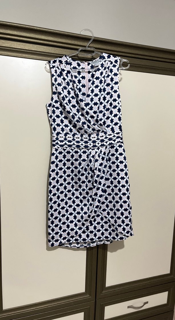 V yaka, kolsuz, kemerli ve desenli mini elbise. Beyaz ve gri tonlarda şık ve modern kesimle günlük kullanıma uygun.