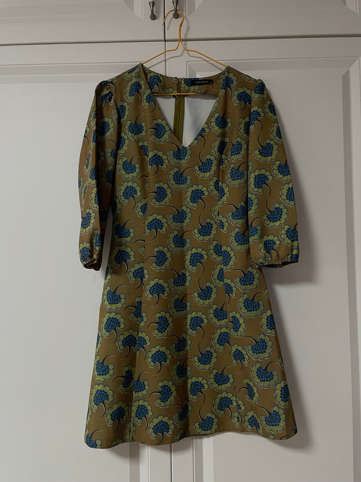Yeşil midi boy elbise, V yaka ve baskılı desenlidir. günlük kullanım için uygun bohem vintage tarzda.