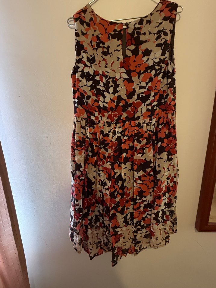 V yaka, kolsuz midi elbise, bol kesim ve drapeli tasarıma sahip. Çok renkli çiçek desenli, yumuşak sentetik kumaştan, açık hava etkinlikleri için uygun.