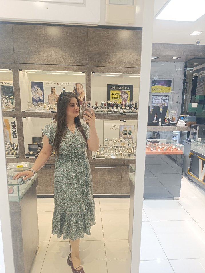 V yakalı, kısa kollu, bol kesim, transparan detaylı, desenli uzun khaki elbise. Günlük bohem tarz için uygun.