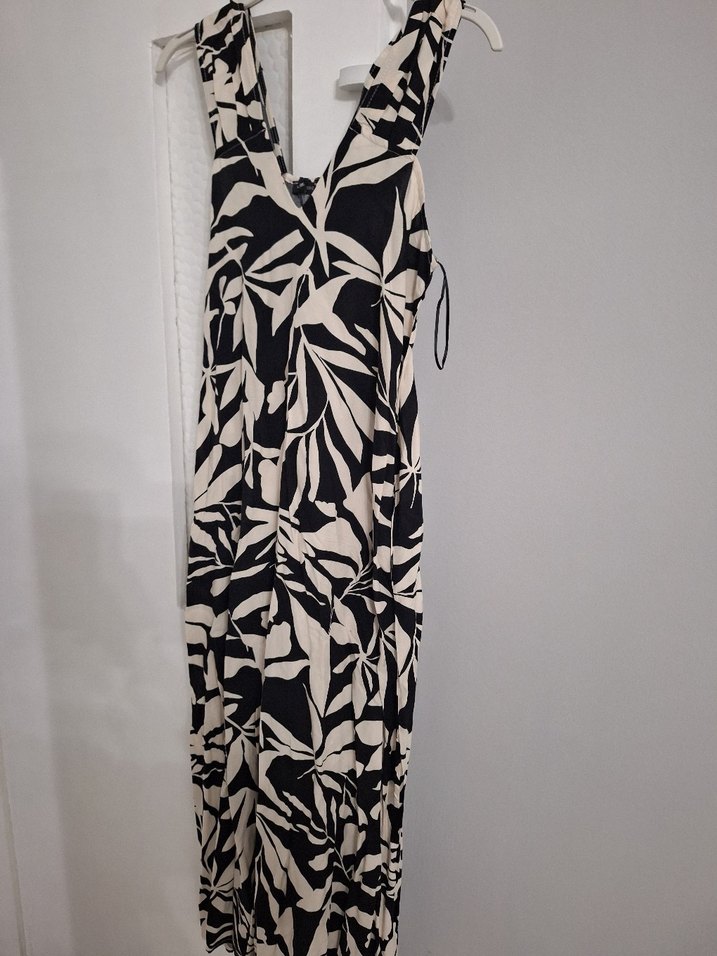Boy 130 cm V yaka, askılı ve drapeli tasarıma sahip, siyah-beyaz batik desenli uzun ve vücuda oturan elbise. Pürüzsüz sentetik kumaştan, minimalist ve çağdaş tarzda dış mekan kullanımı için uygun.