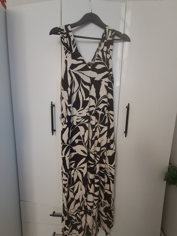 V yaka, kolsuz, bol kesim ve drapeli elbisesi. Sentetik kumaştan, koyu renkli desenli, günlük kullanım için uygun. çok güzel bir kumaşı var 38 36 40 bedene kadar olur