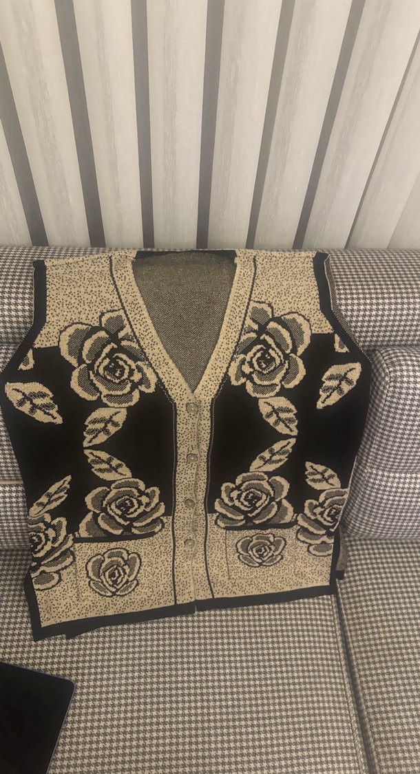 Siyah renkli, V yakalı ve kolsuz, çiçek desenli uzun örgü kadın yelek. Günlük kullanım için uygun, rahat kesim.