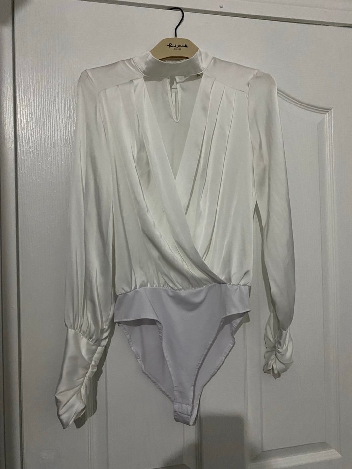 İpeksi kumaştan, drapeli V yaka ve uzun kollu, vücuda oturan beyaz kadın bluz. Günlük kullanıma uygun çağdaş ve sade tasarım. ️
