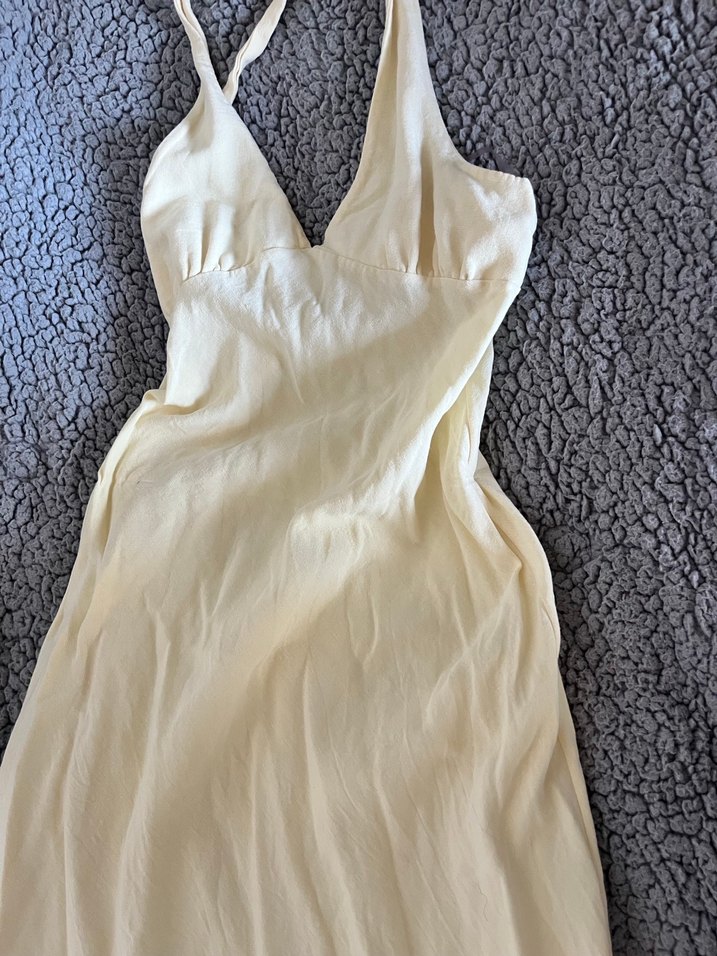 V yaka ve drapeli tasarıma sahip, kolsuz, sarı uzun kadın elbisesi. Vintage bohem tarzıyla düğünler için uygun bir model.