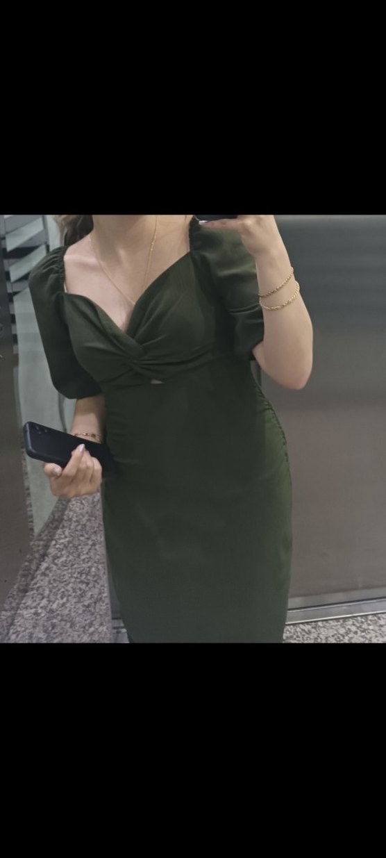 V yaka, drapeli, saten dokulu haki midi elbise, ince askılı kollu, modern klasik tarzda, romantik akşamlar için uygun.
