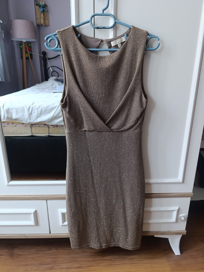 Kahverengi, drapeli V yakalı, kolsuz, midi uzunlukta, yumuşak sentetik kumaştan kadın triko elbise. Minimalist ve çağdaş tarzda, günlük kullanıma uygun.