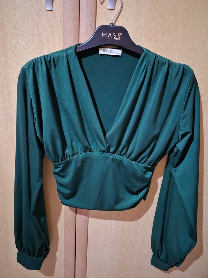 V yaka, uzun kollu, drapeli kesime sahip koyu yeşil kadın bluz. Yumuşak sentetik kumaştan, günlük rahat sokak stiline uygun midi boyda.