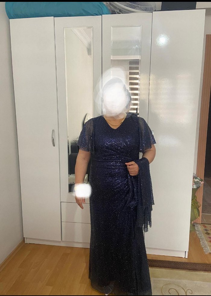 V yaka ve kısa kollu, drapeli detaylı, lacivert abiye elbise. Şık ve göz alıcı, parti için uygun. Sadece birkez kullanıldı ✨