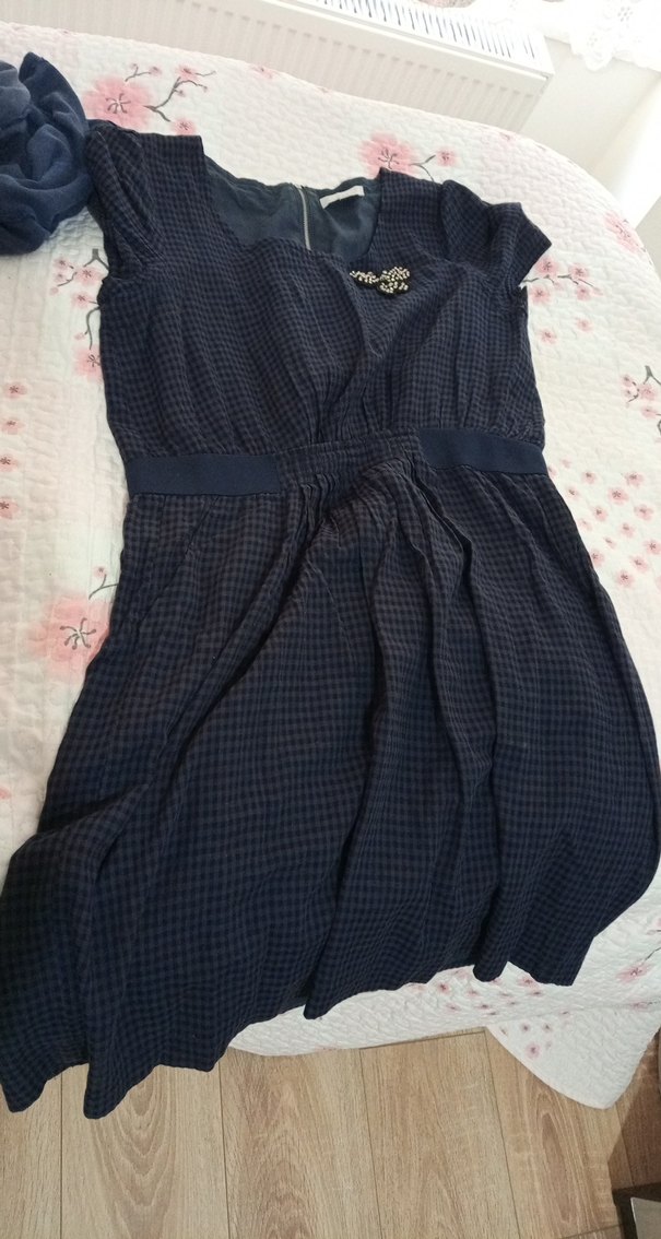 Lacivert midi boy, v yakalı, drapeli ve askılı kollu bol kesim elbise. Yumuşak sentetik kumaştan, günlük kullanım için uygundur.
