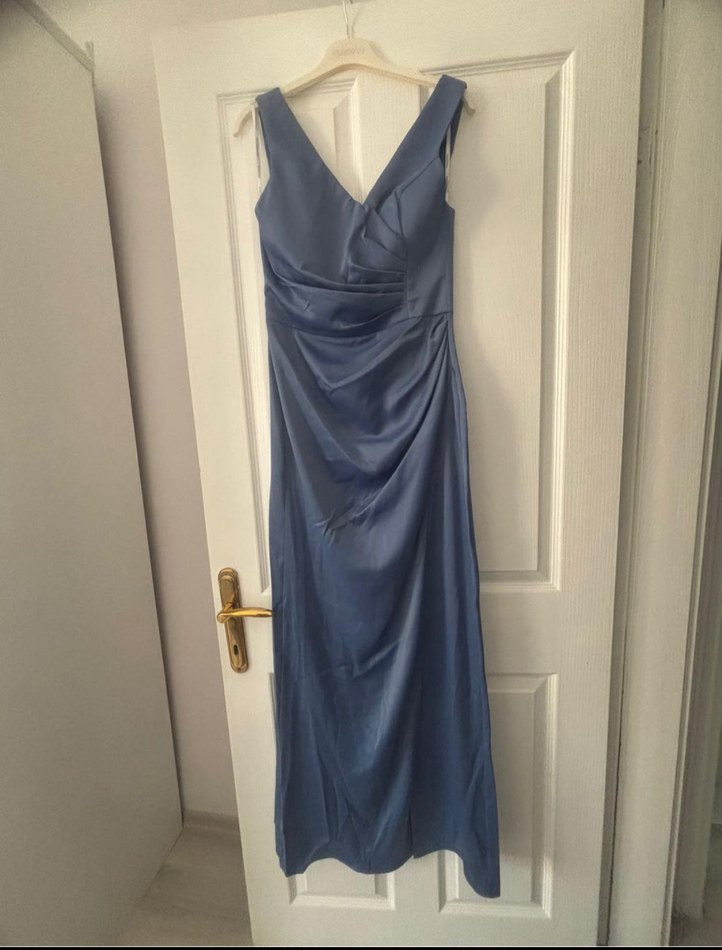 V yaka ve kolsuz tasarıma sahip, drapeli detaylı lacivert uzun abiye elbise. Düğünler için modern klasik şıklık sunar.