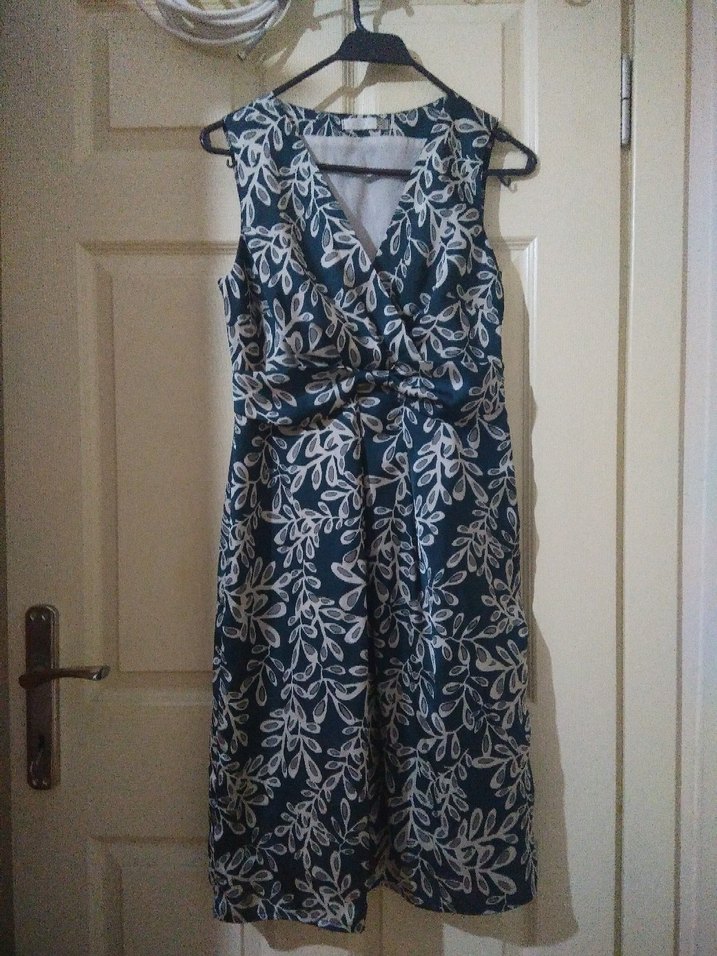 V yaka, kolsuz, drapeli midi elbise. yeşil ve gri tonlarında vintage desenli, ofis için uygun klasik şıklık sunar.