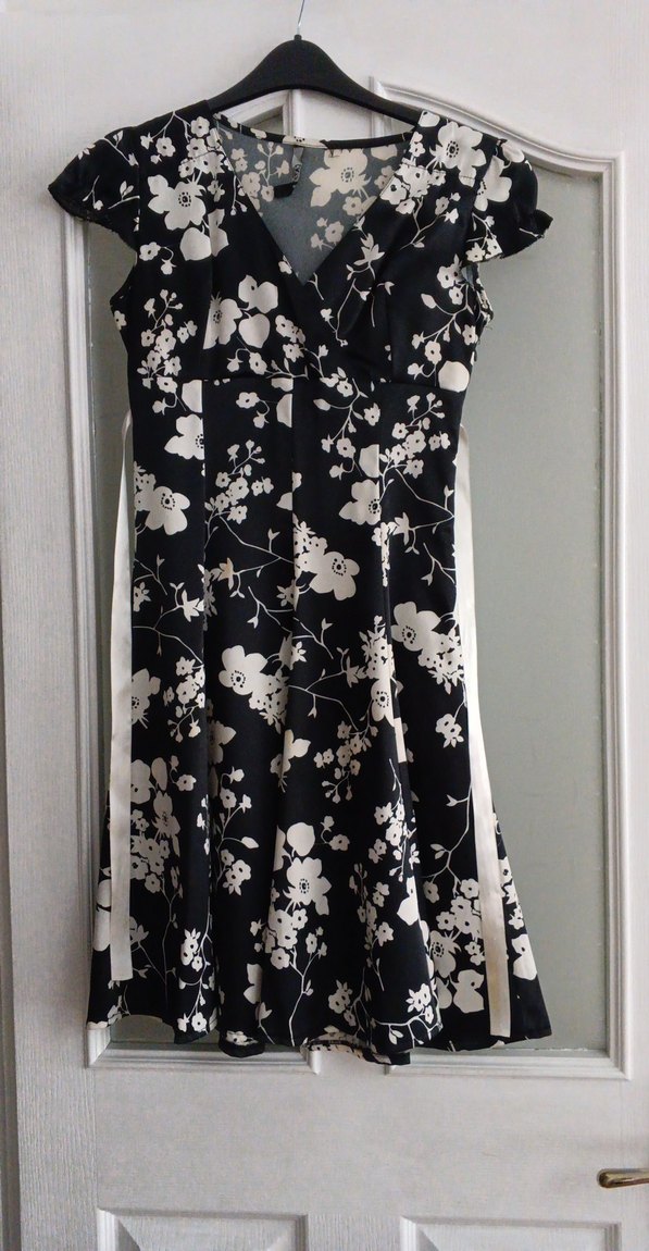 V yaka, drapeli askılı midi elbise, siyah zemin üzerine beyaz çiçek desenli, ince ve şık kumaştan yapılmıştır.