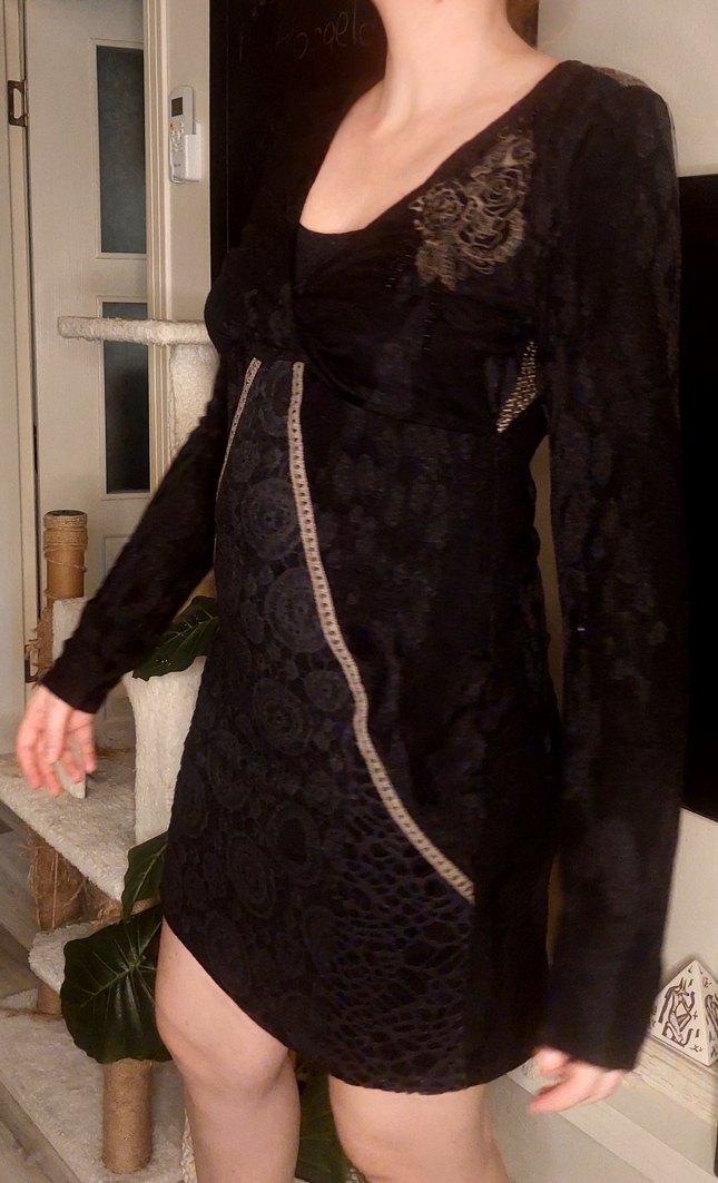 V yaka, uzun kollu, drapeli ve desenli siyah gotik midi elbise, sonbahar için uygun. Esnektir, L beden rahatlıkla giyebilir.