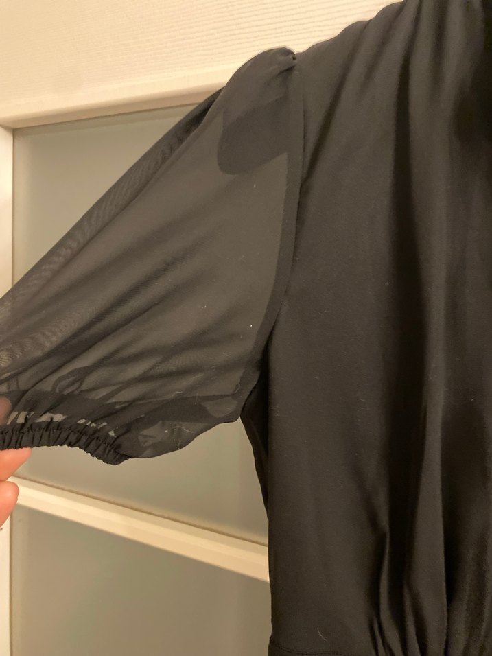 V yaka, drapeli, uzun tül kollu ve midi boyda siyah jifon . Ofis için uygun gotik tarzda şık ve trend.