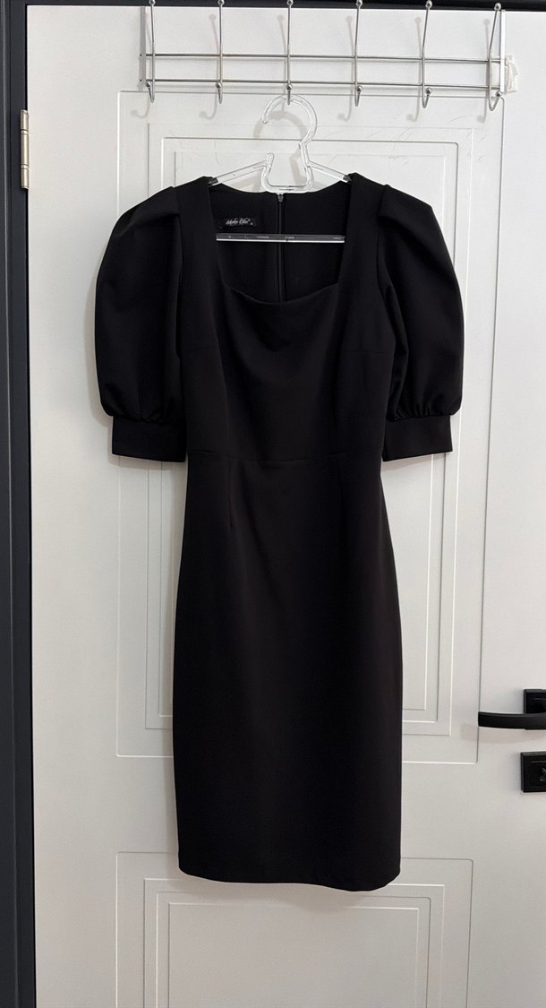 Drapeli V yaka ve kısa balon kollu, siyah fitted midi elbise, ofis için gotik ve avangart tarz sunar.