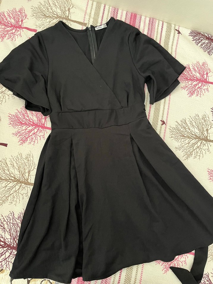 V yaka, kısa kollu ve drapeli detaylara sahip siyah midi elbise. İnce kesimi ve desensiz tasarımıyla Paris tarzı gotik stil sunar, ofis için uygundur.