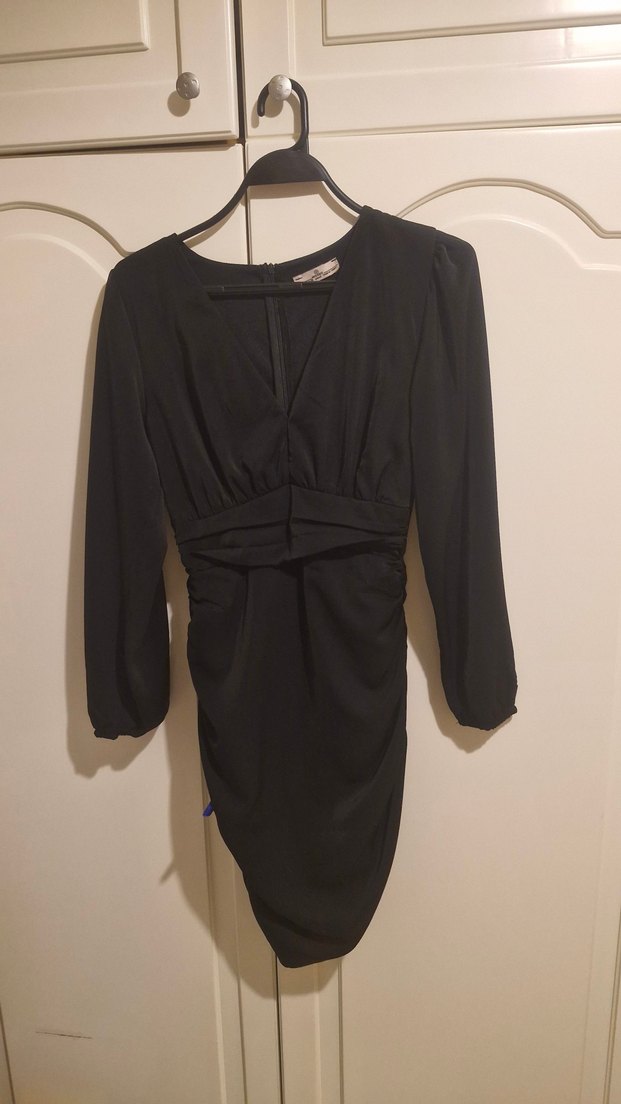 V yakalı, uzun kollu, drapeli siyah midi elbise, romantik gece için gotik tarzda şık bir seçimdir.