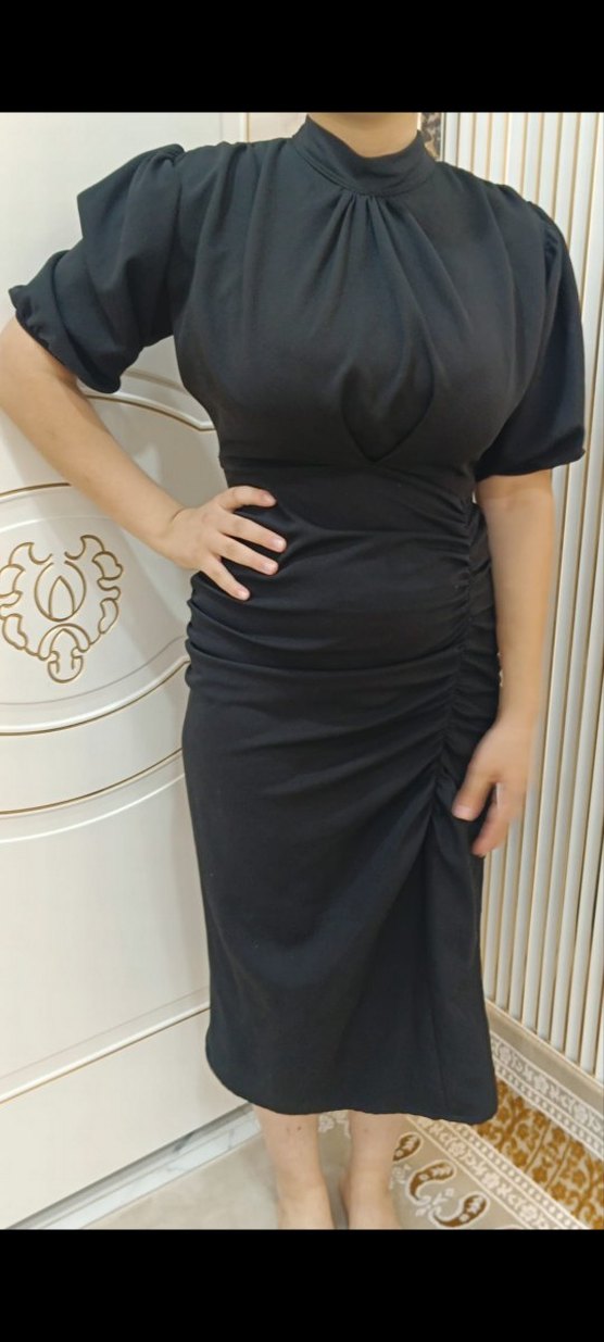V yaka, drapeli siyah midi elbise. Sıkı kesim ve balon kol detaylarıyla klasik şıklık ve gotik tarzı yansıtıyor.