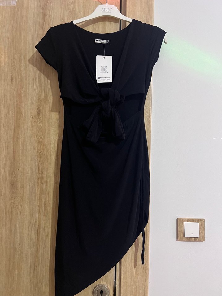 V yaka ve kısa kollu, drapeli tasarımlı siyah mini elbise. Asimetrik etek ucu ile romantik akşamlar için uygun.