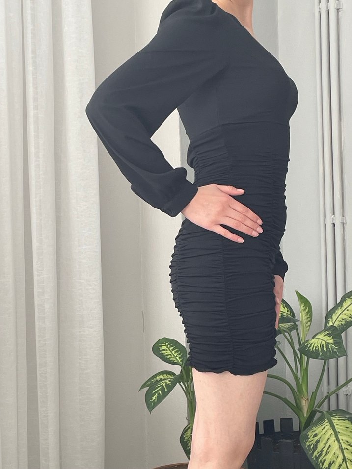 Uzun kollu, V yakalı ve drapeli tasarıma sahip siyah, vücuda oturan mini elbise. Pürüzsüz sentetik kumaştan, romantik akşamlar için ideal minimal gotik stil.