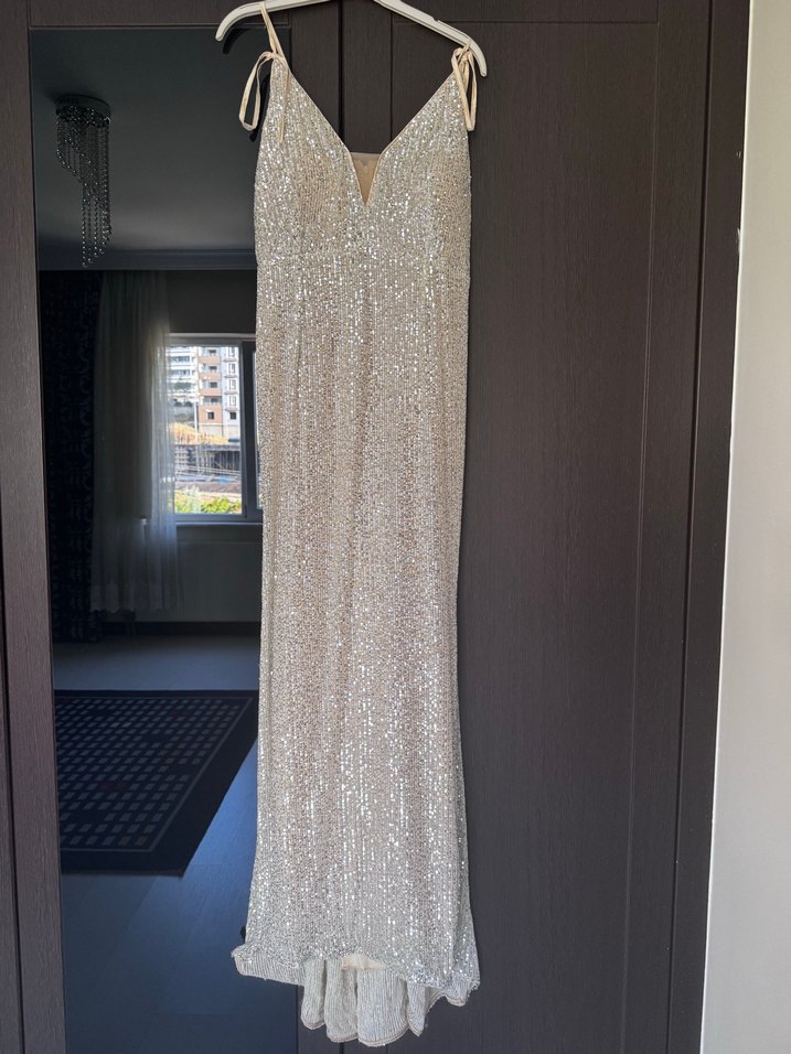 V yaka ve drapeli detaylara sahip, uzun boy gümüş renkli, kolsuz, vücuda oturan abiye elbise. Düğünler için uygundur. ✨