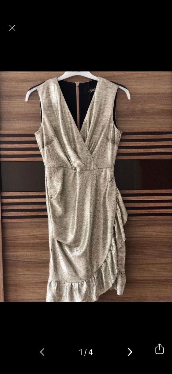 Bej ve gri tonlarda, zebra desenli, V yakalı ve drapeli uzun kollu kadın abiye elbise. Günlük kullanıma uygun, regular fit şıklık sunar.