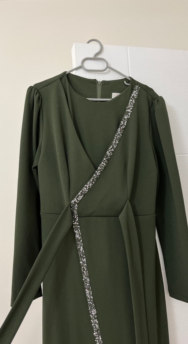 Haki renkli uzun elbise, V yakalı ve drapeli detaylara sahiptir. 2 kere kullanıldı tertemizdir