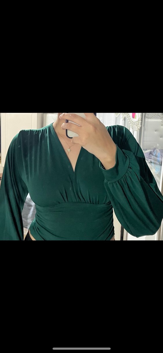 V yaka ve drapeli detaylara sahip, ipeksi kumaştan yapılmış, koyu yeşil renkli, uzun kollu ve midi boyda dar kesim bluz. Günlük kullanıma uygun, minimalist sokak tarzı. 2 defa kullanıldı hiçbir kusuru yoktur
